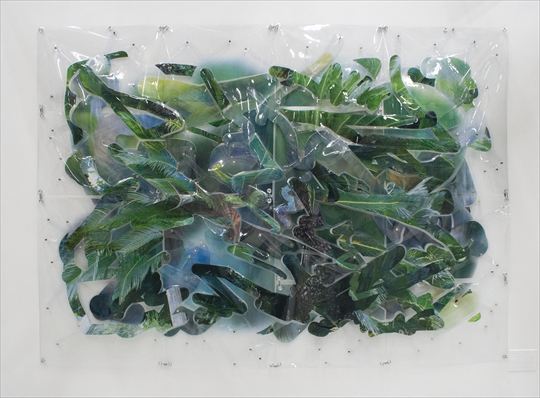 パイナップルの木々 2025年 ビニール、水性インク 1835×2600mm 対象物を全体で捉えようとするとき、様々な角度や距離感で見て 頭の中でイメージを構築する。そういった「見る」とういう行為によって 作り上げられたイメージ像を幕のようなビニールによって表現する。 |