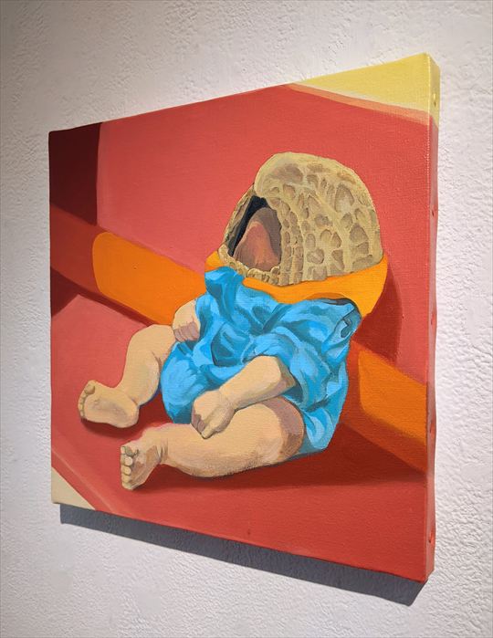 じゅんばんばん 2025 キャンバス 油彩 1620×1620×30 mm 早産で生まれた子は1080グラムしかなかった。 小さすぎるその体躯は保育器の中で、ひっそりと呼吸する。 何もできない母親は、申し訳ない気持ちで 保育器の横で小さくなり、じっと担当医に呼ばれるのを待ち続ける。 生誕への希望、将来への不安、待つことへの焦燥。 それは後光が差す程の。それは籠の中に閉じ込められる程の。 それは100万の願いを集める程の。 それは、殻を破ろうとする子と、殻に閉じこもろうとする母親。 時間は平等に進み、その声はくる。 |