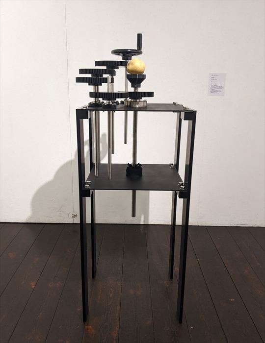 菊池和晃 KIKUCHI Kazuaki 芋の皮を剥くことでさえ Even peeling potatoes 2025 フェルト、鉄 「芋の皮を剥くことでさえ、 それが意識的な活動であるならば、芸術活動である」 そうボイスは言った。であるならば、槌の一振りが、 長い時間をかけ少しずつ岩を削り、 例えば美しい女神の姿を模るように、 そこに明確なビジョンが宿るなら、このハンドルの1回転は より良い社会を彫刻していくはずだ。 だが、ここではひとまずその真偽は置いておく。 私は、タキサイキア現象のような、ぐんと引き延ばされた 一瞬を作りたいと思った。意義や主張、価値観が 挟まる間もないその一瞬を。 何の意義も持たないかもしれない、 その瞬間が完結しないように。 |
