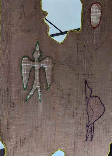 どばし ほのか DOBASHI Honoka 熟すかな 飛べるといいね 落ちる前に 2025 キャンバスに油彩、木炭、 ドンゴロス、糸、鉄、ビーズ 1800×900mm \ 150,000 吊り下げ油彩絵画。 表には2匹の鳥、 裏は木炭で描かれた木と 鳥たちが縫い込まれた 2層になってます。 |