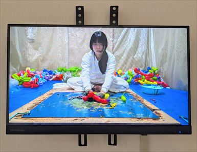 大石 茉莉香 OISHI Marika パープルレイン 雨とミサイル 2025 プロジェクター付き映像データ 120,000円 2映像データのみ 50,000円 ed.10 暗闇の中、線香花火のような「絨毯爆撃」のTVモニタ画面の半分にだけ、雨の動画がプロジェクションされています。 |