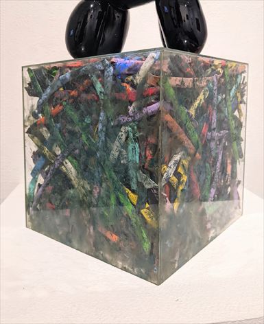 1/X-prop 2025 アクリルボックス、漆、割れた風船 20×20×20mm 選ばれずに、割られた風船の残骸を アクリルケースに封印した作品。 |