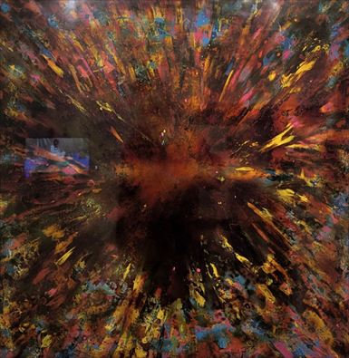 1/X-現場 2025 アルミパネル・漆 803×803×3 mm アルミ板上の漆によって、 大量の風船の破裂跡を記録した平面作品。 |