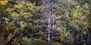 堀江優希 此処 2026 シルクスクリーン、木、メディウム 910×1820 mm \ 132,000 森のイメージを部分、部分、コラージュとして、シルクスクリーンインクをパネルに転写し、画面構成。 見慣れたはずの森の景色が、視点が分断され、認識困難なイメージとして立ち現れています。 |