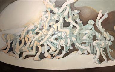 京都の繁華街に溢れる人々の足元を観察し、大胆にコラージュ、デフォルメして描き出した大作。