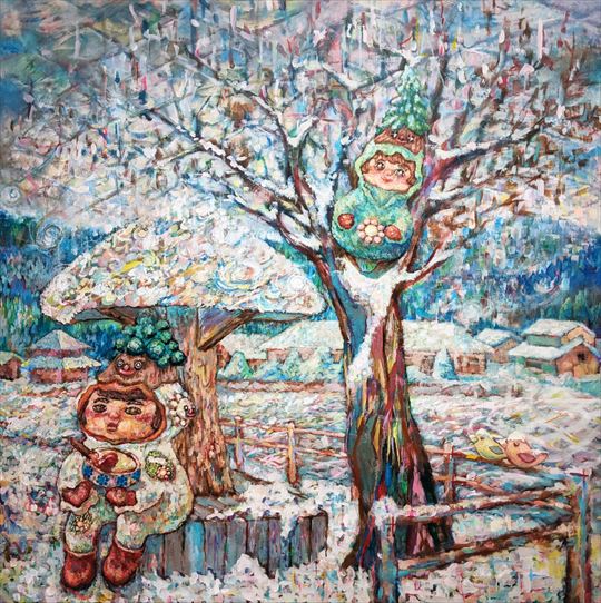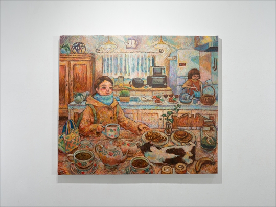ほっと一息ティータイム 2025 キャンバス、アクリル、油彩 157×92×5cm |