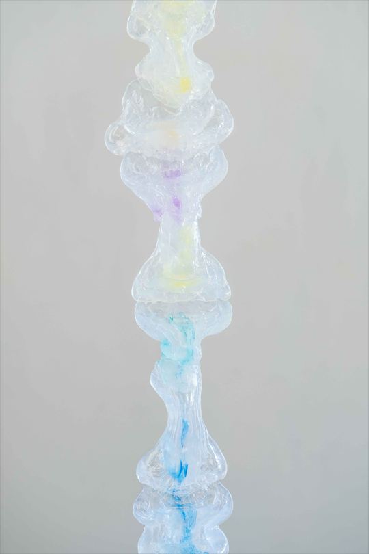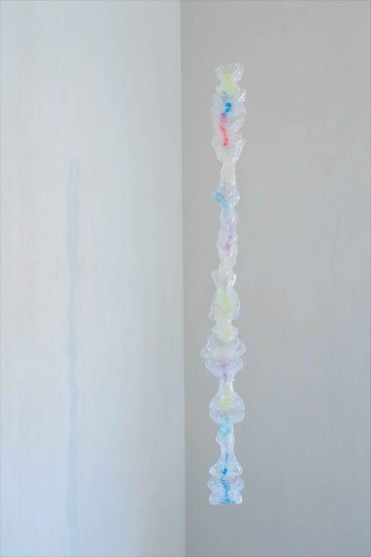 林 葵衣 個展 くばせのつらなり HAYASHI Aoi solo exhibition Shape of Dialogue 2025年10月3日(金)から12日(日) 12:00から18:00 月曜日休み KUNST ARZT では、3年ぶり4度目となる 林葵衣の個展を開催します。 林葵衣は、口紅の痕跡絵画や 口腔内オブジェを通して、 言葉を視覚化するアーティストです。 本展では、口内で硬化させた ポリエチレン樹脂製オブジェに 「時間」を与える試みです。 口腔内オブジェをワイヤーなどでつなぐことで、 その発音された言葉と言葉の間の時間、 無言の時間など、より実際の発話のタイミングを 視覚化することが可能となり、 そのワイヤーが複数になることで、 対話を再現することも構想しています。 (KUNST ARZT 岡本光博) 展覧会コンセプト 目くばせ、気くばせなどの言葉に使用される 「くばせ」とは元来「くわせ」「くはす/食わす」 から変化した言葉である。 目の前の相手と対話するため体内から 言葉を引き出そうとする時、言いよどんだり、 つかえたり、途切れたり言い間違えるのは、 自分が伝えたい言葉を対話相手が 食べやすいよう形を整えるうちに溢れてしまう 身体の身振りなのかもしれない。 選びきれない言葉、不恰好な声、整 わない呼吸が一本の連なりとして 口から吐き出された様子を提示する。 PRESS RELEASE HAYASHI Aoi (b.1988, Kyoto pref, lives and works in Kyoto) is an artist who focuses on the movement of the lips and the production of sound when uttering words. She earned her MA at Kyoto University of the Arts. 作家による解説 本展では、口から発せられる言葉や 声を視覚化する作品を展示しています。 タイトルに名付けた「くばせのつらなり」のくばせとは、 平安時代に「目をくはす〔食わせる〕」という言い方がみられ、 これが「目で合図して知らせる」ことだと 考えられていると知ったことから来ています。 相手に自分の言葉を食べさせること。 これは、1人で食べる適当な食事のような、 または標本のような完結した独り言とは異なります。 他者と対話することは、身構えたり、姿勢を丁寧にしたり、 言葉を整えながら発したとしても、なまなましく、整わず、 どこか不恰好になってしまうものだと考えています。 その姿勢や、声のねじれ、ひずみ、無言の間を 造形化したくてこのような作品を制作しています。 会場に展示されている立体作品は、 温めると柔らかくなり冷やすと固まる ポリエチレン樹脂を使用しています。 この樹脂を自身の口の中に入れ、 一音節や単語などの言葉を発音し、口中の型を取り、 吐き出したものを言葉の彫刻としています。 樹脂と木材やアルミなどの異素材を組み合わせることで 言いよどみや言葉に詰まる様子を表現する 《Phonation Piece -Distortion-》シリーズ、 あくまでも家族の何気ない会話ですが、 仏師である父と摩利支天尊と呼ばれる 仏像について対話している様子を録音し、 発話内容を1人で言い直し、テグスで吊る事により 会話の時間軸、間を同時に再現する 《Phonation Piece -DIALOGUE-》、 しゃがみ、あおぎみ、とぶ、という体の動作と 制作時の造形や形態、空間での展示方法をリンクさせた 《Phonation Piece -SHAGAMI AOGIMI TOBU-(Distortion)》、 樹脂の両サイドから向かい合うように発声し 型取りを行った《Phonation Piece -FURERU-》、 言葉遊びのしりとりは最後と最初が同じであり、 造形として接続が容易で、単語を積み上げやすいことから 着想した《Phonation Piece -SIRITORI-》を展示しています。 樹脂の色彩は、熱を加え柔らかくする際に、 透明色と色付きの樹脂を同時に混ぜ造形しています。 色付けをすることで発話する人物や、 単語ごとの見分けを行うことができ、 かつ彫刻内部の造形が見えやすくなります。 意味をなさない言い間違い、 1分にも満たないささやかな対話の時間や、 他愛ない言葉遊びのしりとりをモチーフとすることは、 自分が暮らす様々な外部環境の影響を受けたうえで、 尚且つ発される、自分自身を発信源とする 個人的な声であることを何よりも重視しているからです。 |
