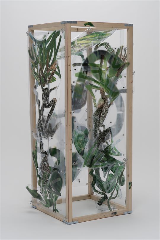 パイナップルツリーのラフボックス 2025年 木、ビニール、水性インク 1600×640××640mm 対象物を全体で捉えようとし、 大まかなサイズ感と方向、 それにともなった像で構築される ”大まかなイメージ立像”を表現。 |