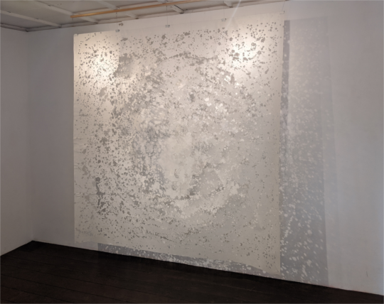 須臾再顕 2019 5000×2000 mm 和紙に絵の具を撒き、できた飛沫を切り抜きます。 絵の具が紙にぶつかり形を成すまでは僅かな間ですが、 それらを長い時間をかけて手作業で行います。 その結果、紙にとっては 一度得た情報を失う空虚な作業ですが、 イメージとしては二次的に顕れ人の手による 時間の集積のみが可視化されます。 |