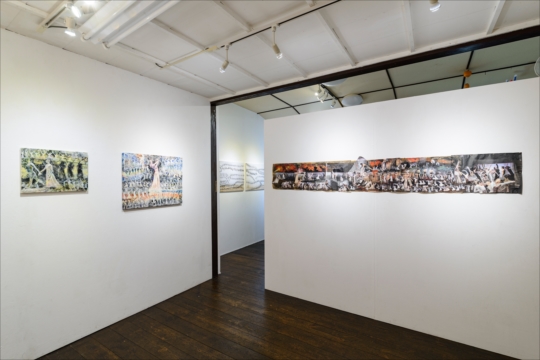 天上の野原 2016 和紙、墨、染料、金箔 700×7000mm ギャラリーフロールでの展示風景 |
