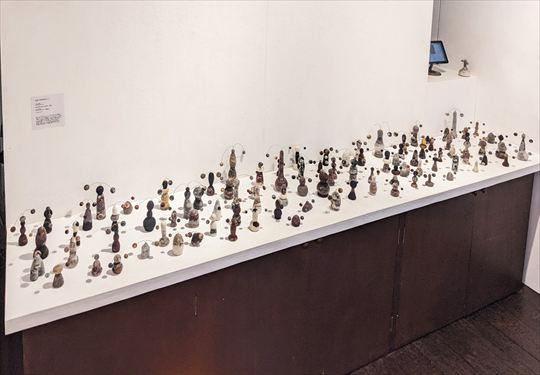 木彗花 TAKAGI Suika Gabe series ○ Gabe series △ Gabe series □ 2025 スマホ粉砕塊, 膠 smashed Smartphone debris, animal glue 簡単に情報を得たり会わずとも誰かと繋がることができる、 手のひらに収まるスマートフォンは、 今の世の中を生きる人々が1番身につけている、 大切にしているジュエリーだと考えます。 当たり前になくてはならない存在であるスマートフォン。 それを粉砕した時、どんな色でも灰色になりました。 まるで世の中の色の様で、輝いてもいます。 便利なツールである裏には、人間の記憶や 欲望が灰化しているように感じます。 小さい頃は、ただ楽しかったり、無心で純粋な 気持ちだった気がします。泥団子や積み木がその例です。 小さい頃に夢中になったことは誰にでもあると思います。 それが今の自分を、少なくとも私たちを作ってくれている気がする。 コンクリートと同じで、地に足をつけて歩いています。 楽しい、悲しい、嬉しい、寂しい。様々な感情は、 人間の美しさです。 自分の目で見て、感じたものも、 信じて大切にして欲しいと私は考えます。 https://youtu.be/Y6AyxeW8vMc |