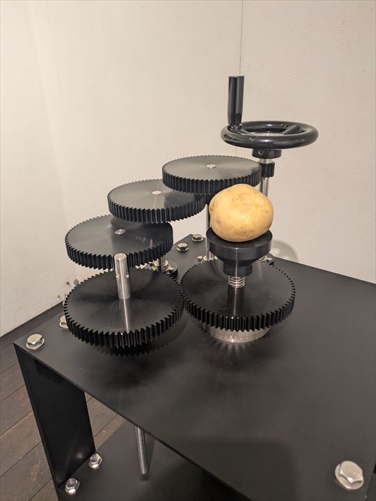 菊池和晃 KIKUCHI Kazuaki 芋の皮を剥くことでさえ Even peeling potatoes 2025 フェルト、鉄 「芋の皮を剥くことでさえ、 それが意識的な活動であるならば、芸術活動である」 そうボイスは言った。であるならば、槌の一振りが、 長い時間をかけ少しずつ岩を削り、 例えば美しい女神の姿を模るように、 そこに明確なビジョンが宿るなら、このハンドルの1回転は より良い社会を彫刻していくはずだ。 だが、ここではひとまずその真偽は置いておく。 私は、タキサイキア現象のような、ぐんと引き延ばされた 一瞬を作りたいと思った。意義や主張、価値観が 挟まる間もないその一瞬を。 何の意義も持たないかもしれない、 その瞬間が完結しないように。 |