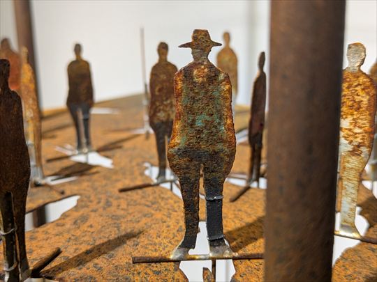 井上明彦 INOUE Akihiko ボイスはガザの夢を見るか? Does Beuys dream Gaza ? 2025 叩いたアルミニウム、LEDテープライト、木材、ビス、留具ほか ボイスの金言 "Kunst=Kapital(芸術は資本である)"は、 左から右に読む。アラビア語では逆に右から左に読む。 等号なのでどちらでも同じかもしれないが、 Kunstが先か、Kapitalが先かで、思考の向きが変わる。 ボイスにとっては、芸術を美的鑑賞物の位置から解放して 社会を形成するあらゆる創造活動に 拡張することが問題だったから、当然前者だろう。 同時に彼は、社会活動の元手となる「資本」を 人間の直感と創造力と捉え、それを黒板の図式でも示していた。 「資本」の語はマルクスの『資本論 Das Kapital』と 結びつけられることが多い。Wikipediaのアラビア語版で 「資本」を見ても、マルクスの原書の写真が載っている。 そもそも「資本」とは何か? 近代資本主義以降、資本とはもっぱら事業の元手となる 資金や生産手段を指すが、それ以前の前期的資本は、 ドイツ語で「大洪水以前の資本(vorsintflutliches Kapital)」という。 ノアの洪水伝説のもととなったメソポタミアの洪水のころ、 バビロンで最古の貨幣としてリング状の銀が使われた。 だが、それ以前や民衆のあいだでは、もっぱら穀物や羊毛が 支払いに使われた。さらに遡れば物々交換だろう。 先住民の世界では今も西洋近代的な資本主義が入り込まず、 狩猟採集で暮らす人々もいる。そこでは「資本」とは、 自然の中で共に生き延びるための知恵や技術、 それがもたらす物的心的な糧であり、それが社会を支える。 これに対し、近代資本主義の行き着く先は、 資本を持った個人や企業、国家が資源を奪い合う戦争社会だ。 ガザに滞在した画家の証言によれば、 生死の境に接して生きる人々は、 報道される悲惨さとは別に、 訪れる人を歓待し、愛し合い、歌い、踊り、 創る悦びを心底大事にすると言う。 ボイスはガザの夢を見るか? |