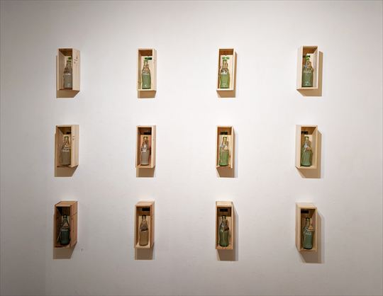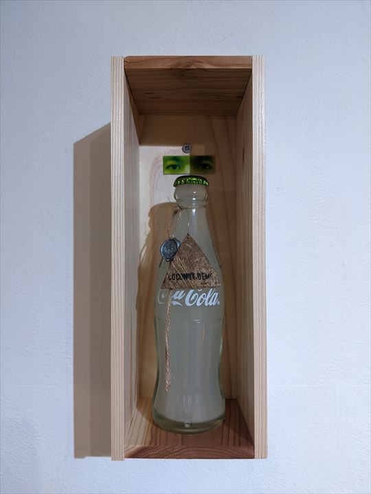 大石茉莉香 OISHI Marika ココナッツデモ コカコーラ Coconut Demo Coca-Cola 2025 コカ・コーラ瓶、ココナッツウォーター、 封蝋、麻紐、ワイヤー、ココナッツの殻、木箱 2021年2月から始まったミャンマーの軍事クーデター。 その抵抗として、道端にココナッツが置かれた写真を見た。 私はココナッツが人しか見えなくなり、 同年7月の個展で、その時点で発表されていた クーデターによる犠牲者数856人分のココナッツ写真を 印刷し水に溶かす作品「ココナッツデモ」を発表した。 今回はヨーゼフ・ボイスの作品"Coca-Cola Tea"の“ 素材を入れ替えることで大量生産のコカコーラ瓶を 彫刻作品へ変換する”という構造と、 "できるだけ世に行き渡らせるための大量に作れる マルチプル作品である"という特徴を借りて、 ココナッツをハンマーで割り、そこから出た ココナッツ1個分のココナッツウォーターを コカ・コーラの瓶に入れた。 木箱には犠牲者の名前を印字し、 犠牲者と同じ数のエディションを展開する。 (2025年12月時点で7,522エディション) 本展では初めの12名分を展示する。 今改めて思うのは、軍事クーデターに対する抗議として 日用品であるココナッツを人の代わりに路上に置く あの行為こそ、ボイスがいう“社会彫刻”そのもの ではないかということである。 ※犠牲者数および死亡者の個別リストは、 AAPPによる 2025年12月時点の公開データに基づく。 |