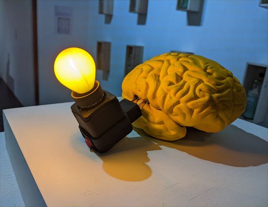 岡本光博 OKAMOTO Mitsuhiro ST#454 IDEA from 25W 2025 脳模型、25W黄色電球、アダプターソケット Brain model, 25W yellow bulb, adapter socket 300×300×150mm わずか25ワットほどの電力で稼働するという人間の脳。 ヨーゼフ・ボイス「カプリ・バッテリー」(1985)の形式を借用し、 脳が稼働する電力を可視化し、リアルな’閃く’マンガ表現オブジェである。 |