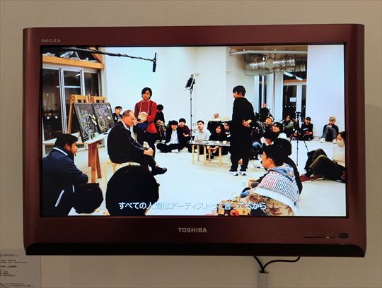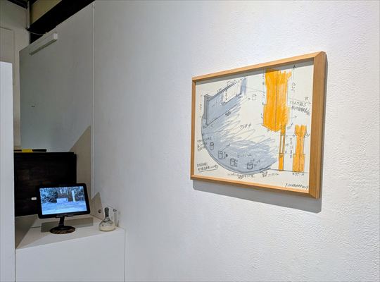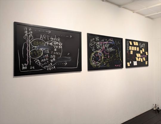 白川昌生+居原田遥 SHIRAWAKA Yoshio + IHARADA Haruka 黒板・2025・京都 2025 黒板、パステルチョーク、付箋紙 920×620×18o each 白川昌生+居原田遥によって行われた 対話集会「今日の芸術の意味と役割について」 (京都市立芸術大学、2025年11月9日) の際に提示され、書き込まれていった黒板3点。 「対話集会」の記録映像 2025 映像 4'11'' 撮影:山根香 録音:藤口諒太、 提供:京都市立芸術大学 *この記録映像は「TOPOS:まなびあう庭としての 芸術大学プログラムB「共にいること──経験の共有」 の事業記録の一部を借用しています。 この3枚の「黒板」は、2025年11月9日に京都市立芸術大学で 開催した「対話集会」をもとに制作されたものです。 この「対話集会」は、「今日の芸術の意味と役割について」 というテーマをもとに対話をしてみようと参加者を呼びかけて 開催したイヴェントで、近隣の学生やアーティストなど、 関心を持ってくれた方々が集まってくれました。 会の冒頭では、対話のための前提や問題提起、 あるいはきっかけとして示されたドローイングがあり、 これはアーティストである白川昌生が制作したものです。 ドローイングにもあるように、白川が示したのは、 今日に至るまでの長い人類の歴史のなかで、 芸術がいかに本質的な営みであったのか、 そのあり方や変遷、そして現在の社会と芸術を とりまく制度についてのキーワードと図像でした。 この「黒板」をきっかけに、1時間半の対話が行われました。 そのなかで出された論点の提案、質問、コメントが付箋紙に書かれ、 追加されていきました。途中で黒板に直接加筆される場面も ありました。この「対話集会」と「黒板」という提示の形式は、 ヨーゼフ・ボイスが1984年に来日した際に東京藝術大学で 開催した「対話集会」およびそれに近い実践を参考にしたものです。 対話集会では、白川が提示した芸術の意味をめぐる議論、 芸術という位置付けやカテゴリについて、さらには 今日の芸術をめぐる問題についてなど、多岐にわたる意見や 問いが出されました。とはいえ、1時間半ではとても収集のつかない、 散漫とも言える議論や主張がいくつも飛び出しました。 なんらかの結論や意見の統合を行うことを目的としない からこその「対話」でもあるのですが、同時に憤りも感じました。 また反省もありました。まずは、時間が短かったこと 。終わりを設定しない対話だからこそ、もしかすると体力の続くかぎり、 気が済むまで続けるべきだったのかもしれません。 そして、これはとても深刻に受け止めていますが、 ありがたいことに多くの方々に参加していただいたものの 、そのなかで女性が発言しづらいような環境をつくってしまったことです。 これはイヴェントにおける発言者の中心が男性であったことを 意味していますが、けしてその発言者に責任があるわけではなく、 その場を設定した私を含む場全体の問題です。 誰しもが参加しやすくあるべき「対話」のあり方を より丁寧に検討すべきだったと感じています。 はじめてボイスの対話集会の記録映像を見たとき、会 場の熱量には驚いたものの、その対話の持続の可能性と展開は、 正直つまらないなとも思ったものです。しかし、実際に自分でやってみて、 この持続と展開への憤りと、対話の場それ自体への反省が 最も重要なのではないかとも気づきました。現在あるべき、 そして残していくべき「対話」とはどのようなものなのでしょうか。 2025年京都で行った私たちの対話は以上のような結果でした。 なにより今の時代を生き続けるために、「芸術」をめぐる内容に限らず、 対話と、その実践のための思考を、 ひとまず根気よく続けていかなくてはいけないと思います。 (text by 居原田遥) 白川昌生 SHIRAWAKA Yoshio 群馬県朝鮮人強制連行追悼碑のためのドローイング 2024 紙に鉛筆、オイルパステル 410×310×21o (frame) 白川昌生 SHIRAWAKA Yoshio 群馬県朝鮮人強制連行追悼碑のための映像 2025 映像 白川昌生 SHIRAWAKA Yoshio 出雲信仰はアートになる 2025 映像 2015年に白川が制作した作品 《群馬県朝鮮人強制連行追悼碑》のためのドローイングと、 そのモチーフである群馬県高崎市の県立公園 「群馬の森」にある朝鮮人強制連行犠牲者追悼碑を めぐる経緯を白川自身が記録し編集した映像です。 また、近年白川がリサーチと作品制作のテーマとしている 出雲信仰に関する記録の映像も併せて展示しています。 《群馬県朝鮮人強制連行追悼碑》は、朝鮮人強制連行の 歴史を記憶するために群馬県の公園に設置されていた 追悼碑をもとに、布と構造体を用いて仮設の モニュメントとして提示された作品でした。 しかし、この作品を美術館で発表しようとした2017年当時、 元の追悼碑の撤去の是非をめぐる議論が続いていたこともあり、 白川の作品自体も展示中止となる事態が発生しました。 結果として2025年現在、このモチーフとなった「追悼碑」は、 公園から撤去されています。映像ではその場所の記録と