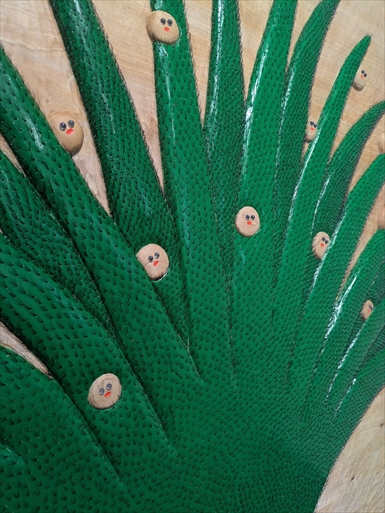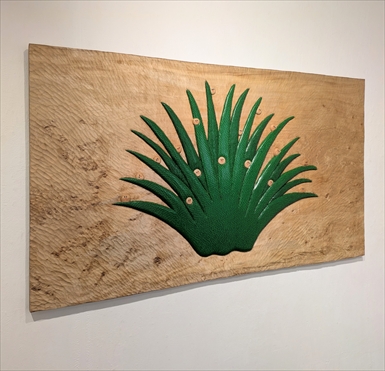 荒川朋子 ARAKAWA Tomoko 雨あがりの草 Grass after the rain 2025 トチ、つけまつげ、ガラス、カシュー horse chestnut, false eyelashes, glass, cashew 1600×35×910 \ 605,000 トチの巨大な1枚板から “雑草”を削り出したレリーフ。 トチならではの質感を残し、 遠近を“毛“の密度で表現しています (画像ではなかなか伝わらず)。 作家満足のシンボリックな逸品。 |