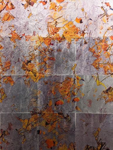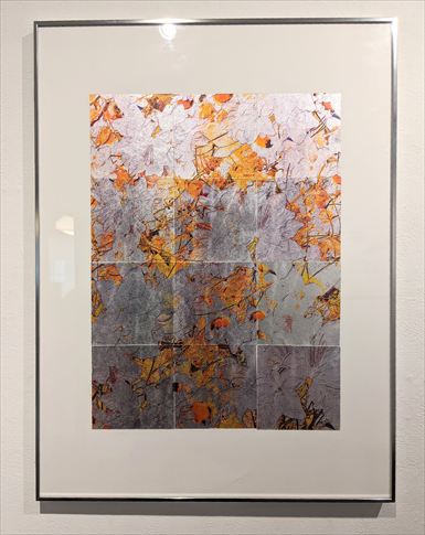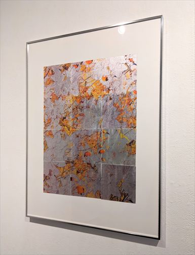 有田西騎 発酵した植物4 2025 水性インク 本銀箔 紙 54.7×73×2.7cm (額サイズ) \ 90,000 本銀箔にシルクスクリーンで 花のイメージを刷った 12枚のピースから構成。 経年変化を起こす銀であることで、 ピースそれぞれの銀の色合いの 微妙な差異が画面に 奥行きを与えています。 |