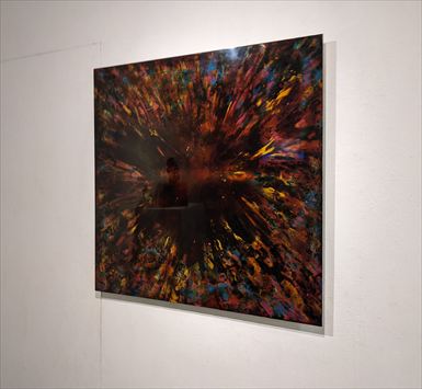 1/X-現場 2025 アルミパネル・漆 803×803×3 mm アルミ板上の漆によって、 大量の風船の破裂跡を記録した平面作品。 |