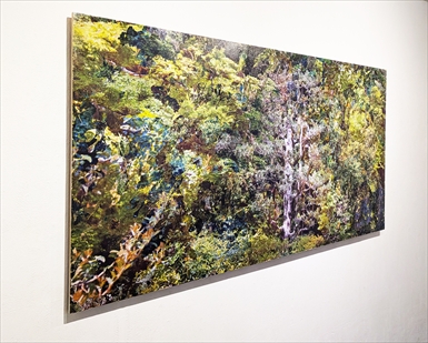 堀江優希 此処 2026 シルクスクリーン、木、メディウム 910×1820 mm \ 132,000 森のイメージを部分、部分、コラージュとして、シルクスクリーンインクをパネルに転写し、画面構成。 見慣れたはずの森の景色が、視点が分断され、認識困難なイメージとして立ち現れています。 |